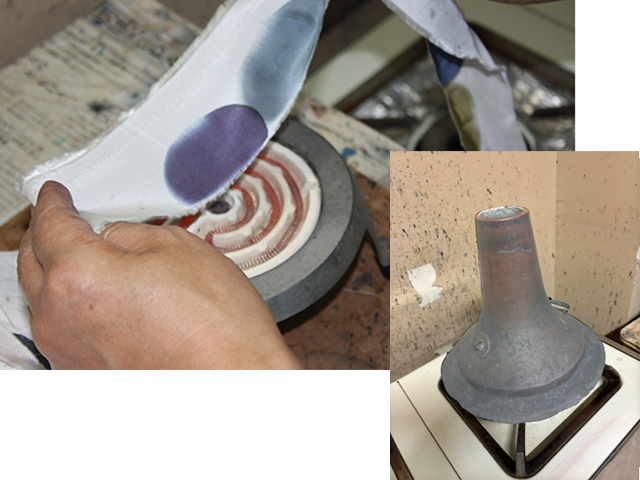 Dissolve the dyes in boiling water and mix the colors. Dip a small piece of fabric into the dye solution, dry it, and expose it to steam. This process is required to verify that the desired color is achieved. Color matching varies depending on the temperature, humidity, and fabric area at the time, requiring years of