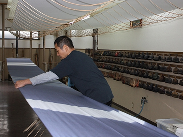 乾燥している間も途中で生地が傾いたりしない様に、また染めの具合を見ながら緩やかに乾燥させるなどの注意が必要となります。